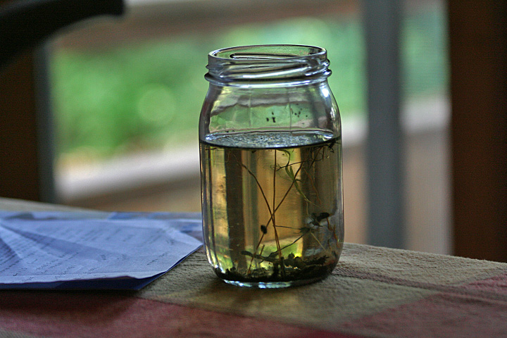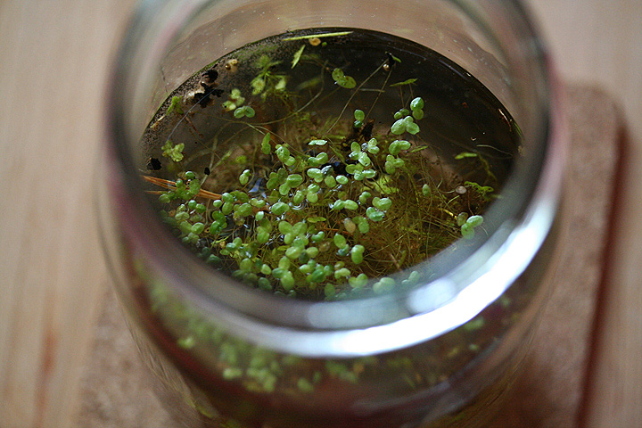 there's something different about the jar of duckweed. one thing, all the rootlets have disappeared. they might've rotted away, which would explain the slightly brown tinge to the water, or maybe the snails ate them. didn't see snails 2 weeks ago, maybe they hatched from eggs, or were always there. these are fast snails though, they can move from the top of the jar to the bottom in less than 10 seconds. also in the jar: daphnia. you might remember them from high school biology, seen through a microscope. they swim around in that weird segmented way. i think the duckweed need more sun, they don't look so well. i wish there was some way to transfer the daphnia to the fish tanks (guppies love to eat daphnia) without infecting the fish would god know's what other microscopic organism is growing in that jar of essentially pond scum.