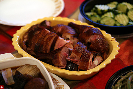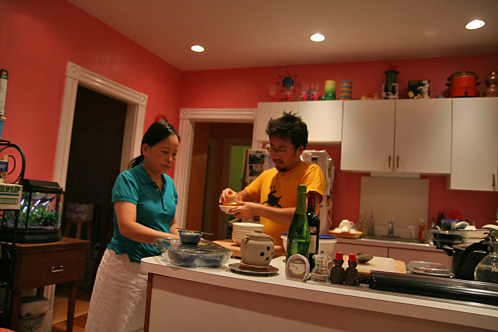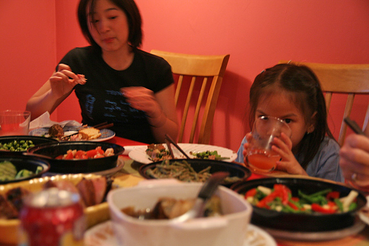 besides my parents, my godmother as well as the hsus came over (the parents, their daughter vanessa, and their granddaughter). the hsus brought me a present, some bags of costa rican coffee and some chocolate-covered coffee beans. i haven't seen mr.hsu since the fall of 2003 when my father and i went to costa rica. i think he was in boston last year october but i'd just missed him since i was coming back from china. my godmother made most of the dishes; my parents made the giant stewed meatballs and i made some fresh jalapeño bread (for some reason it only rose 50%) as well as the flan for dessert.