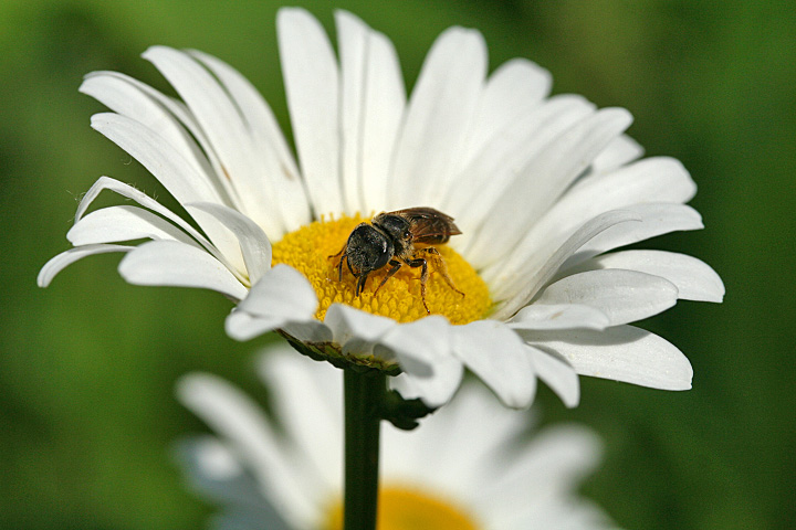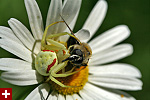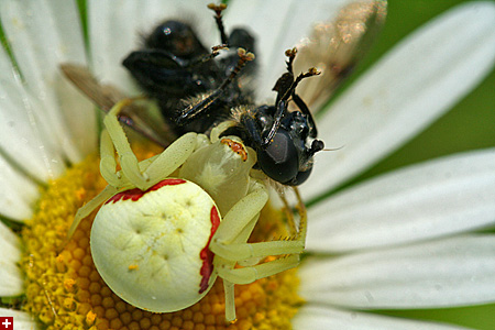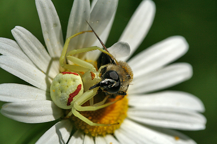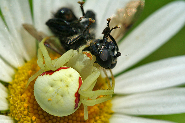 the most exciting thing i saw today was a goldenrod spider with a captured bee-mimicking fly on a daisy. i could tell from far away that there was something going on, because there was this yellow blob and a crumpled black husk on this flower. when i got close i could see it was a spider and its prey. goldenrod spiders are cool, they come in two different colors, either white or yellow, depending on what color of flower they're hiding on. i can usually find them in a field of wildflowers, waiting patiently to ambush an unsuspecting pollinator. because they're ambush predators, they're pretty tolerant of intrusive camera lenses, which they make easy subjects. one of my favorite things about these spiders is their eyes: a triangle wedge with 8 dots, very futuristic robotic. i also think their abdomen resemble ritz crackers.