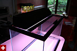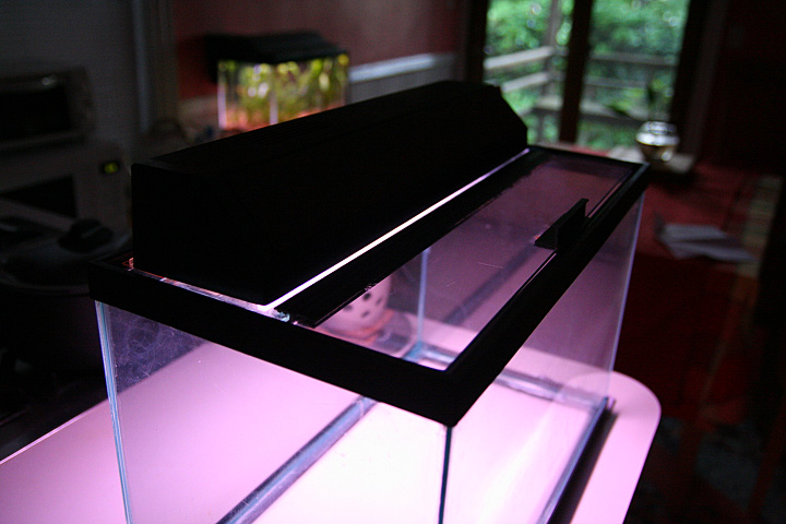 so he must've been in the hobby for a long time. this latest tank, i got a large bag full of plastic/rubber aquatic plants. they're not even realistic looking, painted metallic silver and blue, it'd be great if i was setting up an alien underwater seascape. there was also a lot of equipment for an under gravel filter. the general consensus these days is under gravel filters aren't very efficient (it's a pretty old-school water filtration method, largely replaced by power filters and more advanced methods). i lucked out on some of the other equipment though. i thought there would be just one fluorescent light strip but turns out there were two. they have that fake wood-paneling look and they're both old (the white plastic housing have yellowed and warped) but they still work. instead of a regular hood/cover, i got a glass hood, which in my opinion looks a lot better than the traditional black plastic hood. the aquaclear power filter is for a 50 gallon aquarium, which is overkill for my 10 gallon tanks (i think at one point the previous owner had a much bigger aquarium). i knew this when i got the inserts at the pet store; i figured i'd get them now, so if one day i do decide to use the filter (on a bigger tank), everything will be ready.