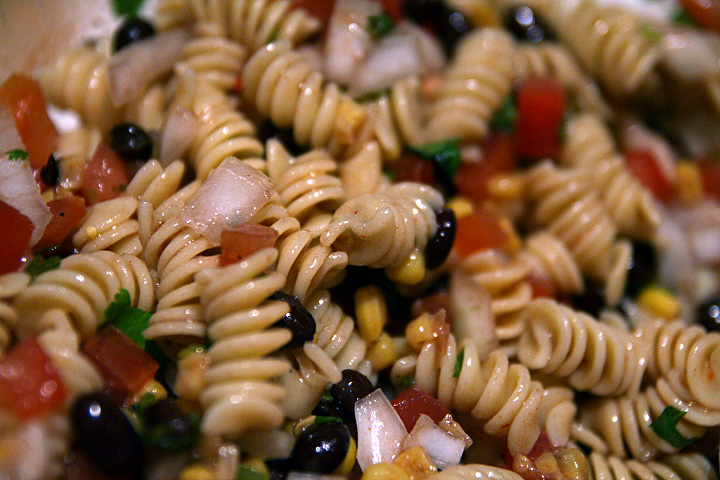 i've had pasta salads at parties but never made one before. these are the ingredients i used: half a box of rotini pasta, one large onion, 3 tomatoes, cilantro, can of black beans, can of corn, 4 small chili peppers, lime zest. and for the dressing: 1/4 cup vegetable oil, 1/4 cup apple vinegar, dash of paprika, dash of cayenne pepper, teaspoon of sugar, 2 tablespoon of ketchup, lime juice, dash of grinded sichuan pepper corn. i blended the ingredients and let it chill in the fridge for about an hour. when it was ready to serve, i poured the dressing and blended everything together again. next time, i think i'll add some prosciutto for an extra bit of saltiness. as for taste, it was a blend of sweetness from the corn, citric zing from the lime, sourness from the apple vinegar, and spiciness from the chopped chili peppers and the cayenne powder. it was so easy to make, i think i might make pasta salad more often from now on.