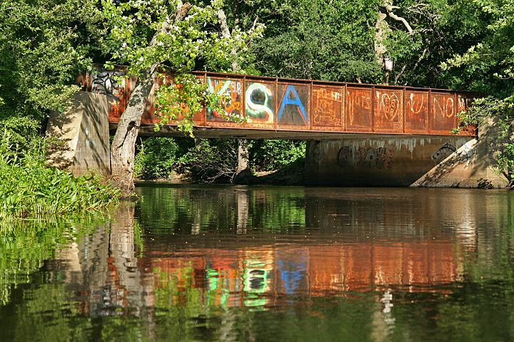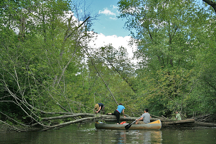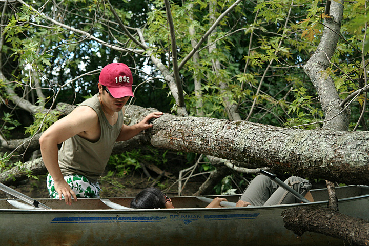 so i'd say for the first few hours, it was all about figuring out how to steer and propel. we actually had three paddles, and cecilia and i - sitting in the center - would trade paddling duties, while jerry and olivia paddled throughout. in hindsight, it probably wasn't a good idea paddling from the middle because you're at a lower center of gravity and harder to paddle as effectively. on top of that, both cecilia and i didn't know how to swim. she said she wasn't afraid of water, but everytime the canoe jerked suddenly, i could feel her tensing up. it didn't take me too long to get the hang of canoeing. i think i had the basic j-stroke, sort of like stirring the river with a big paddle spoon. i also quickly figured out how to deflect the water to turn the canoe in the opposite direction. despite all that, the canoe still moved in an inefficient zigzag manner, and for the first few hours we kept on crashing into the shore, occasionally spinning the canoe 180 degrees. on top of that, the river has a lot of debris in the form of submerged rocks, large tree branches, and occasionally entire toppled trees. i didn't mind though, it was like a puzzle, and each obstacle was like a game to solve. sometimes we had to go underneath. other times, somebody might have to actually get out of the canoe and pull. but most often it was figuring out which side to paddle in order to clear the obstacle.