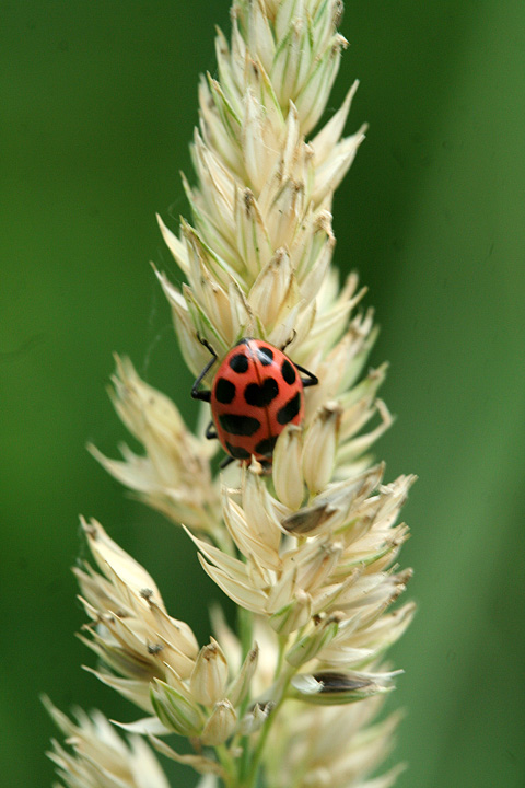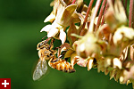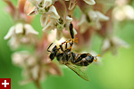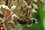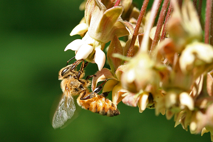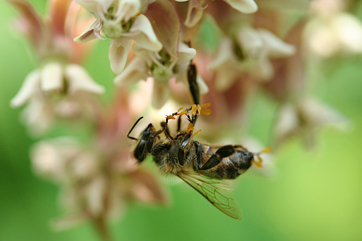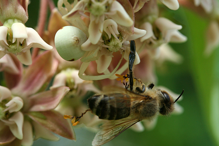 there's all this news about honeybees mysteriously disappearing. i did see some honeybees visiting some milkweed flowers. i also saw a dead honeybee. a crab spider was hiding nearby, most likely the cause of death. apparently their bite is venomous (for insects at least), which either kills or paralyzes their prey before they're sucked dry.
