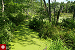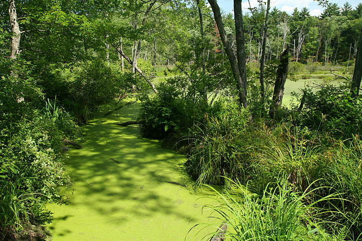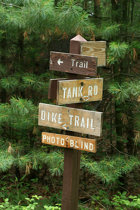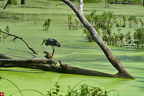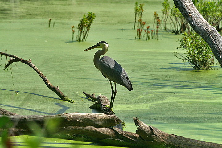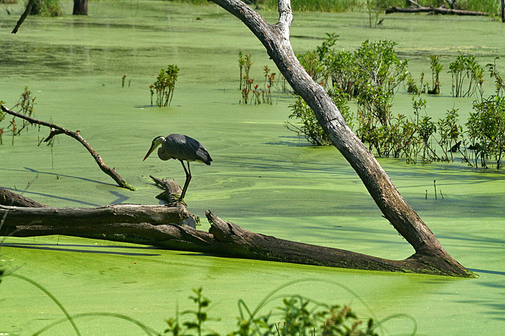 normally i'd follow the river and do the loop back out to the parking lot, but today i decided to go in the reverse direction, walking down tank road (an access road) before connecting to the dike trail. that part of the trail opens up to a large beautiful wetland where the resident great blue heron can often be observed. i almost missed it because it was standing still, perched on a floating log, waiting to ambush some lunch. i slowly pulled out my telephoto, even though it was broken. i managed to get a few photos after fumbling with the lens (although most of the time it gave me that error message). it was also very hot and sweat mixed with bug spray would sting my eyes. at one point the heron stabbed at something in the water and either pulled out a small fish or a large tadpole (best heron feeding i ever saw: april 2006). i moved to a different location but two hikers scared away the heron with their loud talking. i gave them a half-hearted wave as they walked by.