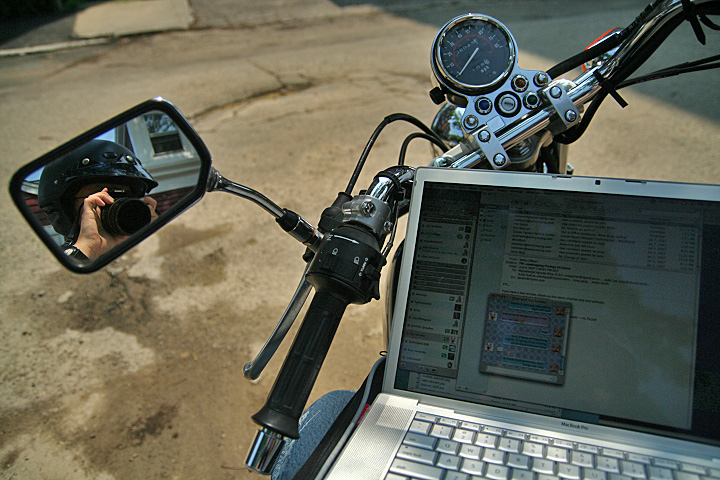 i casually asked the guy what i should do with the parking sticker, since i can't put it on the motorcycle (it's one of those reverse stickers that goes on a window). "oh, maybe you can just carry it with you." what? that's just proof that even the people who work there don't know what to do about motorcycles. back outside, i tried my laptop and was lucky to find an open wifi signal. i got in touch with client S and was happy to find out there were no fires to put out during my brief absence.