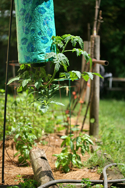 after i cleaned up, i went to belmont briefly to water my parents' garden (something different: since i still had on my contacts from running, i wore sunglasses, something i almost never do). good news: all the vegetables are still alive. bad news: because they haven't been watered regularly, they seem stunted compared to my own vegetables. i basically drowned all the plants, watering each one until i could see a pool of water collect around them. the upside down tomato is still alive as well, seemingly healthy, curling upwards now. anyone who has a garden should get one of these. i can't wait to see how the tomatoes are going to grow upside.