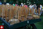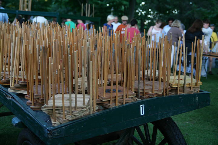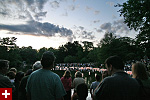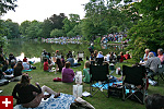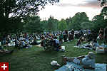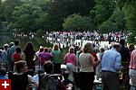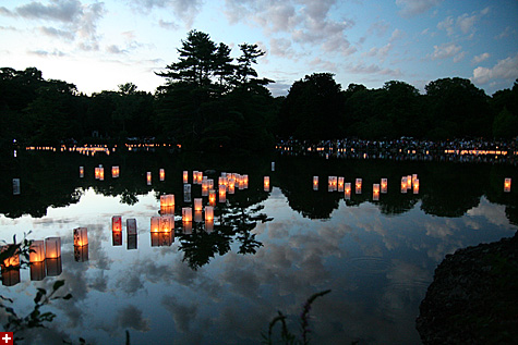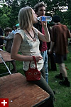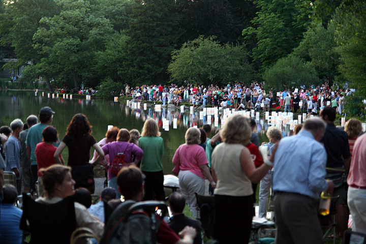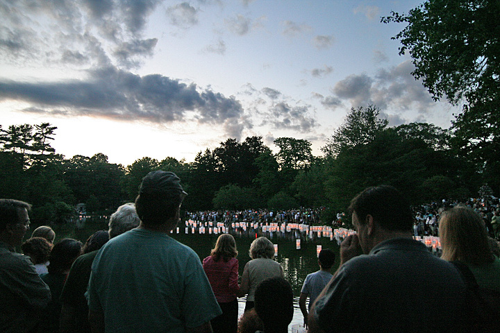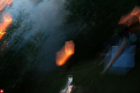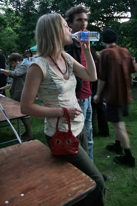 with its many rules of conduct, it surprised me to see people picnicking, or riding their bikes, or (worse) bringing their dogs. i'm no traditionalist, but to me it seems to somehow violate the sanctity of a graveyard. i guess they do things a little bit differently south of the charles. anyway, there was a chance that eliza and her boyfriend romain would show up as well. i walked around the pond once, basically waiting for the sky to darken and for the lanterns to be launched. around 8:20 i met up with eliza and romain. while waiting around for the action to get started, eliza was feeling mighty thirsty. looking at a nearby table there was an unopened bottle of water, which we managed to goad eliza into stealing. we all took a drink to solidify our crime.