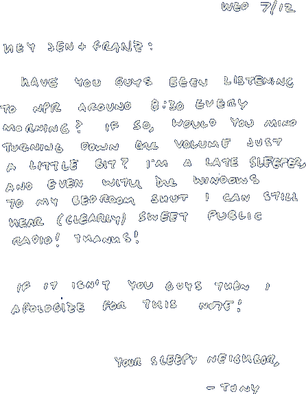 8:30. i awoke to the loud sound of NPR blaring from my neighbor's kitchen window facing my bedroom. no matter how hard i tried, i couldn't fall back asleep. enough is enough! in my mind i started to write the note i would eventually send to them.