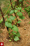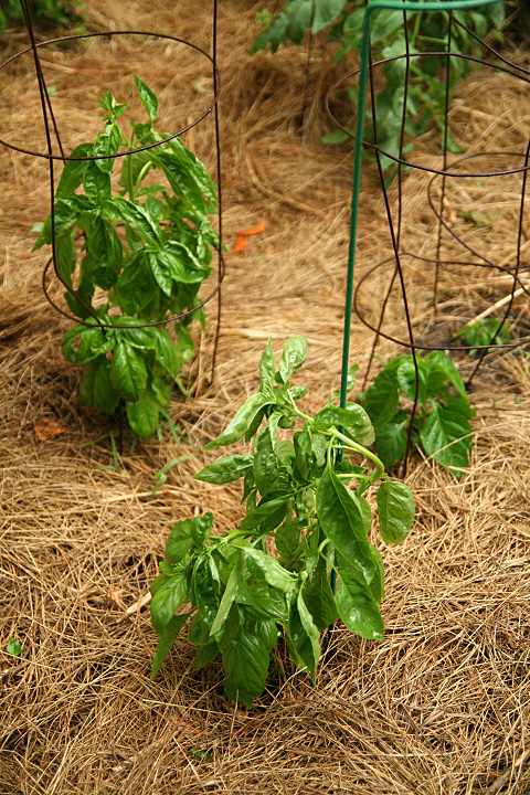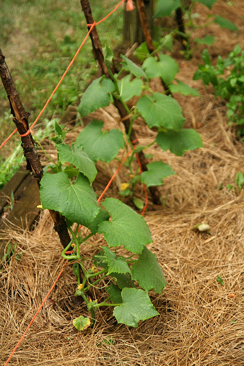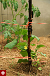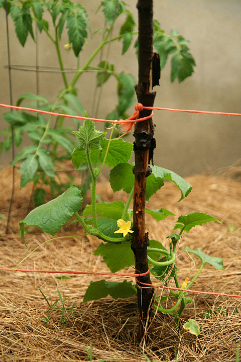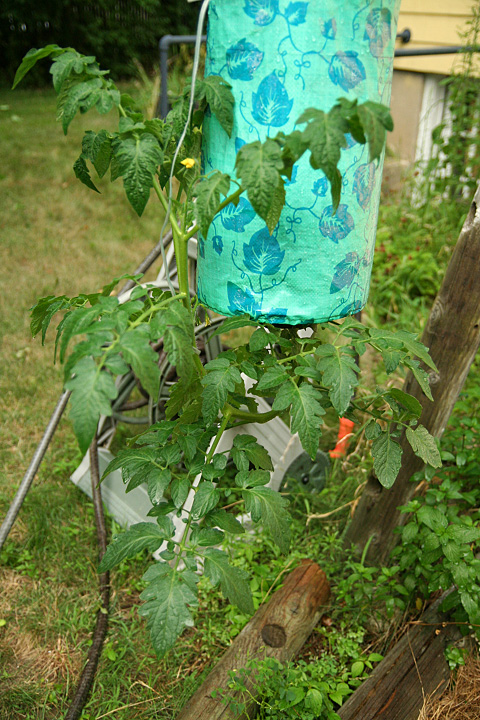 while watering the plants, the pressure from the sprayer broke the stem of the hanging tomato. it was growing quite top heavy in a very unusual way, not sure why i didn't notice the warning signs and tried to tie some of the larger branches. my father held the thing in place with a garbage tie, hoping the injury doesn't kill the plant.