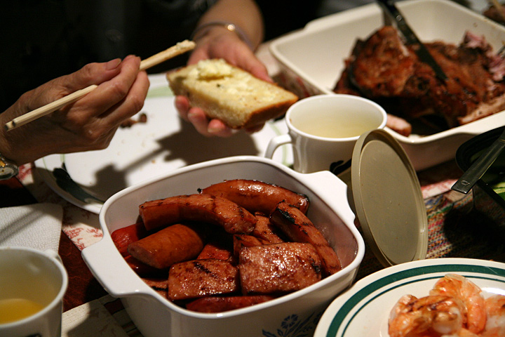 after a good night sleep, i woke up hungry and made a salmon cream cheese on an onion bagel for lunch. the threat of possible thunderstorms kept me inside. instead, i was glued to the television, watching the afternoon red sox game (they lost, unfortunately). my mother called to remind me to make a bread for tonight. i went out briefly to get some monterey cheese, coming back, i ran into my next door neighbor, the one i sent the note. he apologized for the noise and invited me to his wife's birthday party that was happening later today. feeling like i needed some me time and wasn't up to chitchatting with strangers, i passed on the party. instead when the bread was done (6pm), i drove out to my parents' place. jawen, suhan's ex-girlfriend, was there for some reason. soon afterwards my father came home with my grandmother and aunt.