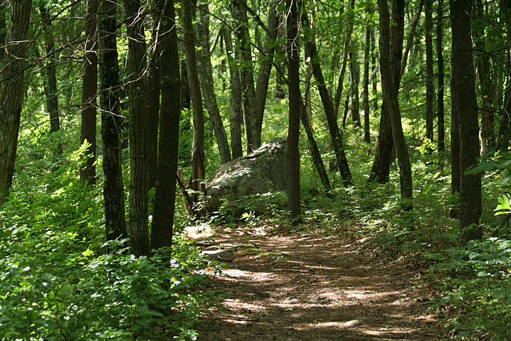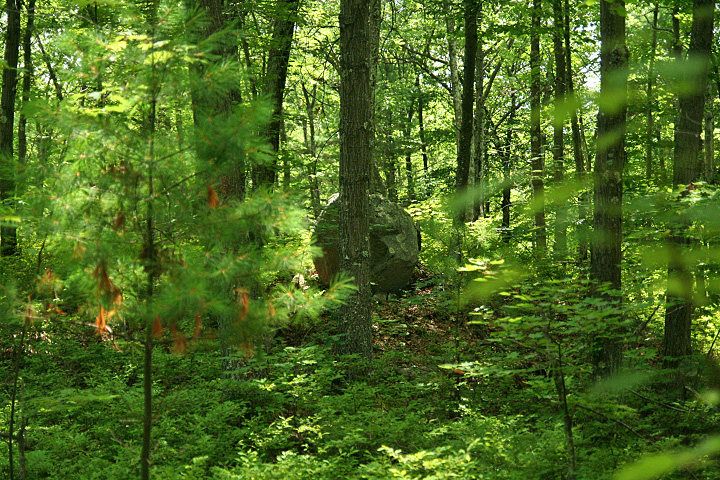 so i basically spent 3 hours walking around the forest (for a total of just 2 miles round trip, i walk slow). i didn't see anyone other than two mountain bikers and a man riding on the trail on a motorcycle (not even a dirt bike, a real motorcycle - i'm sure that's illegal). scenery-wise it's pretty monotonous, a mixture of oak, pine, and sassafras. i thought i'd come across some streams but they were none to be found (or just dried up). reports of small pockets of red maple wetlands can be found in the interior but i wasn't in any mood to do any bushwhacking (even though i did have my gps in case i got lost). fans of glacial erratics however will have a field day as the place is littered with large boulders of various size, shape, and precarious balance. mosquito-wise the concentration was moderate but probably only because i sprayed with picaridin. to enter this forest without protection would be suicide. despite my long-sleeved shirt, the mosquitoes still managed to bite through, a few times on my elbows and shoulders (i'll wear a windbreaker next time, more impervious). besides the occasional bird/chipmunk chirp, the only other noises were the sighing of the wind blowing through the tall trees and the intermittent buzzing whispers of insectile obscenities.