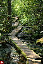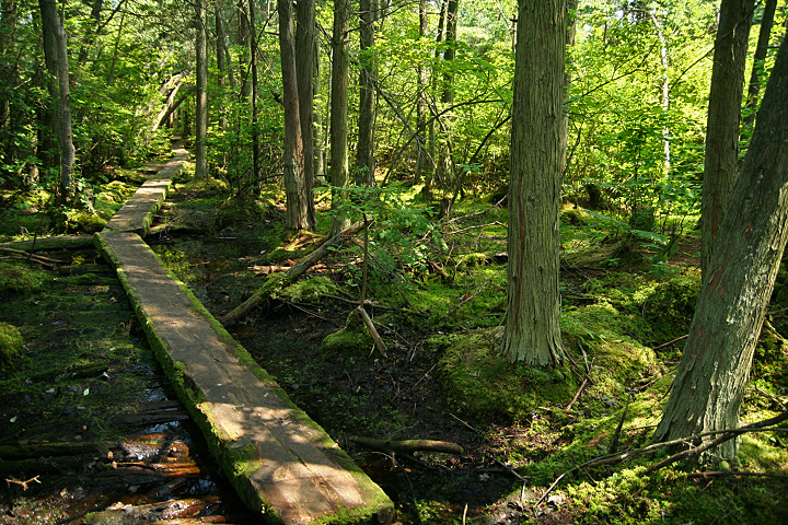 the water level changes dramatically at the bog. back in november, the place was pretty much flooded. now here at the end of july, the water level has subsided and in many places there's just wet mud. there was a teenage couple in front of me, but since i go pretty slow on the boardwalk, i didn't run into them until they were coming out. also at one point a man walking his large black labrador came up the boardwalk. i felt repulsed by his utter lack of bog respect, letting his dog splash around in the floating layer of sphagnum moss, and god knows what else.