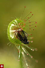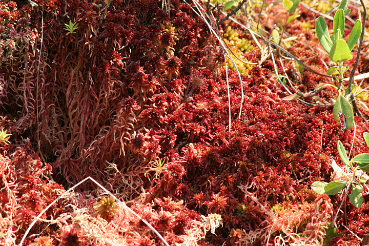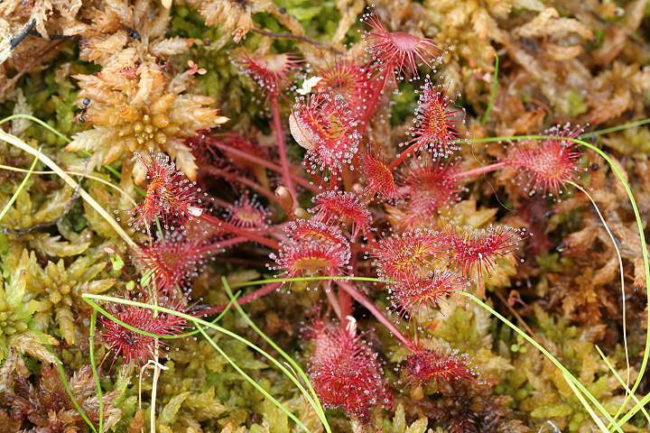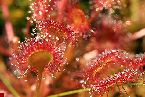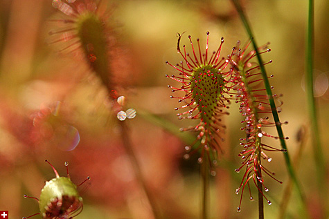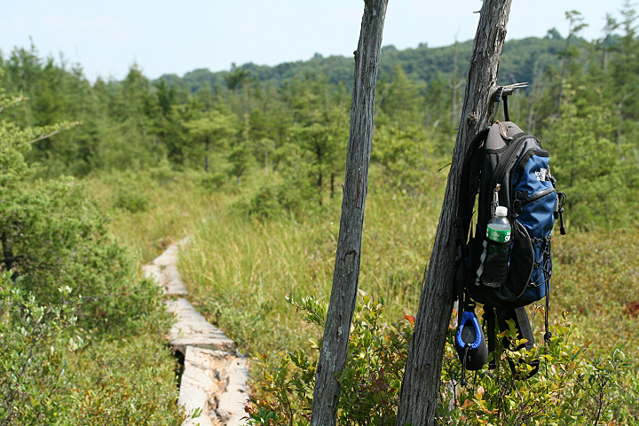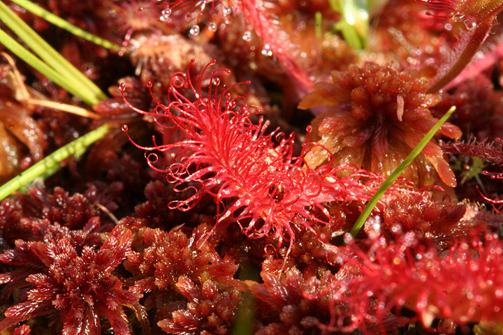for most of these sundew photos, i was laid out flat on my stomach with my camera just inches from the wet sphagnum moss where the sundews were growing. whenever i found a suitable broken tree branch, i'd hang my bulky backpack from the natural hook.