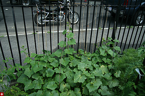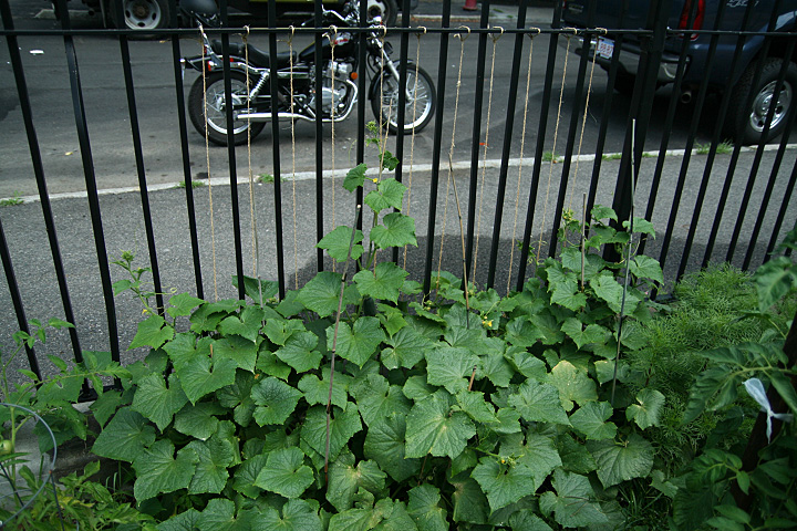 early this morning, i went out to cash my checks (including the money my mother gave me yesterday to help pay my bills) before visiting my garden then julie's garden. i tied some strings on the metal fence where her cucumbers are desperately trying to climb but with little success. i've told her before but she didn't take my advice so i'm doing this secret favor for her while she's away. the metal fence is too smooth for the cucumbers to get a good grip; plus, the metal heats up in the sun and will scald the cucumbers. hopefully before she comes back i'll have her cucumbers trained to climb the ropes already.