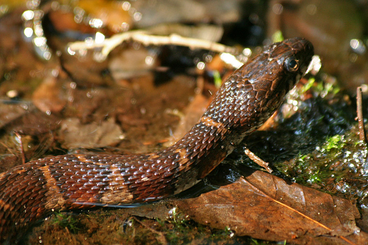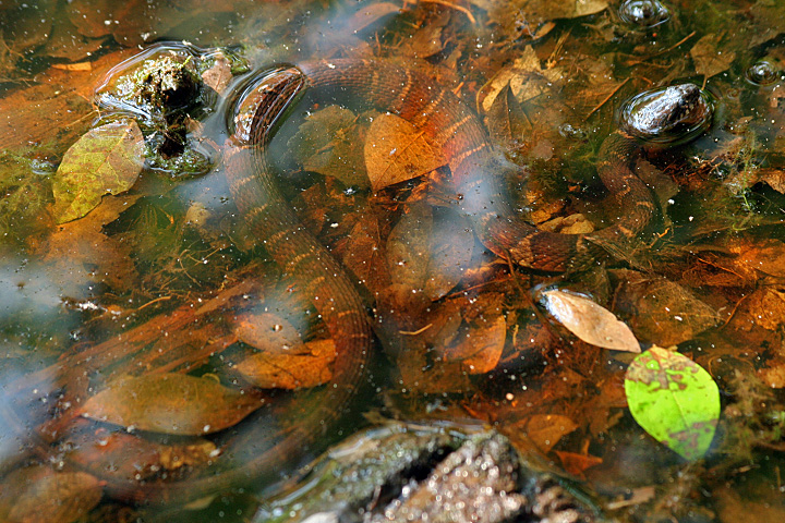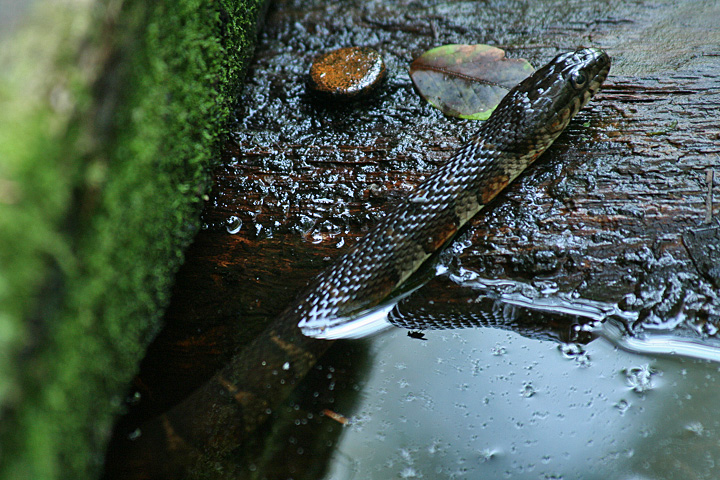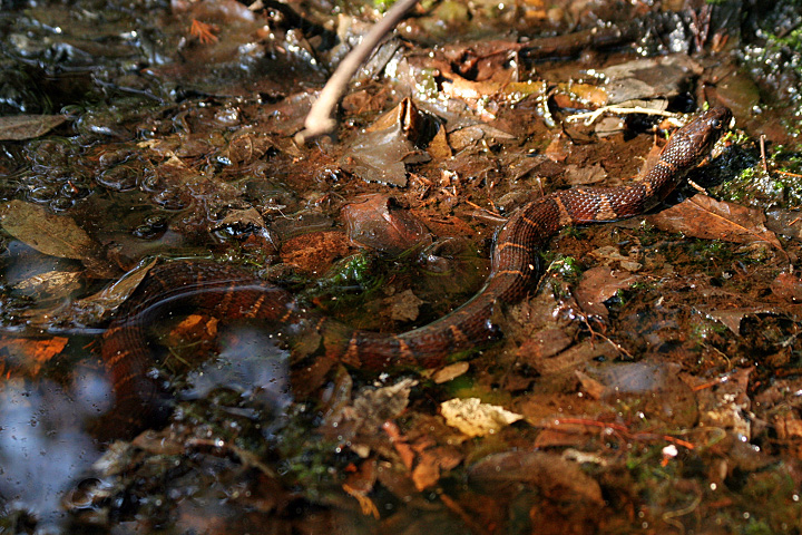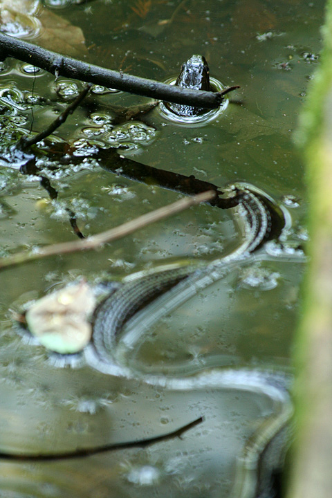 today's naturing has been approved...by snakes! i have a lovefear relationship with snakes. but i've found that my best nature outings come when i encounter snakes in the field. getting the serpentine seal of approval is the ultimate indication that a particular nature spot is pretty good, since you don't find snakes just anywhere (and especially not if you're noisy or not observant of what's around you). leaving the bog, i saw something moving in the water. at first i thought it was just a frog jumping away, but when i noticed multiple ripples i knew it was too big to be a frog. then i saw the long black body of a snake. it wasn't particularly big, no more than 2 feet. initially i thought it was a black racer snake, then maybe a milk snake, but after closer examination, it turned out to be just a water snake. these snakes are the most common ones i encounter when i'm out and about. unlike garter snakes, they can easily be found since (as their name implies) they live near the water. at first it slithered away when it heard me approaching, hiding underneath the wooden boardwalk plank. but since snakes are cold-blooded, i knew sooner or later it'd have to come out to keep warm and sure enough it poked its head out. it was doing something i've never seen before, where it kept perfectly straight, imitating a branch. once it felt safe, it slithered out to a sunny spot in the reddish bog water. now up to that point i hadn't gotten any mosquito bites, but because i was standing so still taking photos of this snake, i ended up becoming mosquito food.