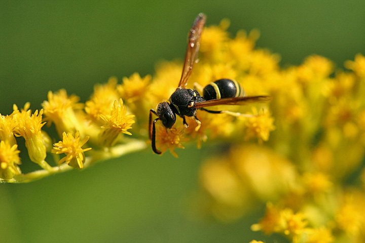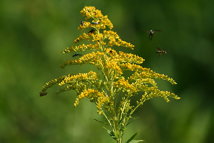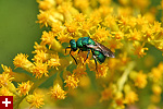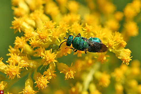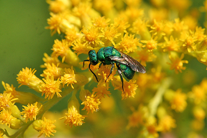 insect-wise, i was surprised by the lack of dragonfly activities. maybe it's still too early in the season? i'll have to check my records, but i could've sworn usually by this time the place is teeming with them. i didn't see anything new although i did manage to get a few good photos of these metallic-green cuckoo wasps. i've seen them before, but they're hard to photograph because they're sort of small and secretive in nature. i found a bunch feeding on some goldenrods and spend a good amount of time playing around with the camera, trying to get some clear shots. cuckoo wasps are named that because like the cuckoo birds, they're cleptoparasites, laying their eggs in the nests of other insects and when their youngs hatch, they eat all the food, sometimes the host insects as well.