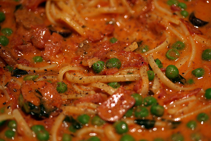 in the evening i made some pasta with the leftover prosciutto i had in the fridge. i think the meat's bad because i had an episode last night after i taste-tested a slice, but i figured if i cooked the hell out of it it'd be safe. i threw in some green peas and made a sauce out of tomato paste, chicken broth, and white wine. it tasted okay but was 3x saltier than what i normally eat. later i had another episode (apparently bad prosciutto is bad even after you cook it, good to know). for dessert i had a mango my grandmother gave me today and some ice cream.
