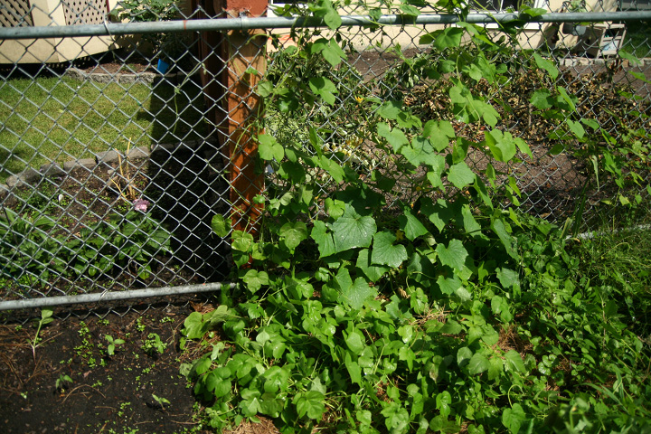 my plot actually sits next to a residential property, separated by a chain-linked fence. the owner of the house have been doing some recent landscaping, and i noticed they pulled (and killed) some of my cucumbers and morning glory vines that'd been making their way down the fence. i don't really mind but the fence doesn't really belong to anyone, and they could've at least asked before killing some of my plants. in other gardening news, almost all the sunflower seedlings i transplanted have died. maybe they don't do so well transplanted, or maybe it was the shock from recent slew of hot weather we've been experiencing. i still have about half a dozen sunflower plants, hopefully i'll see some flowers before the season's over. my tomatoes have been growing like crazy. i don't want to brag, but i believe i have the biggest tomato plant in the entire garden. sure, my tomatoes aren't red yet, but the plant is so huge, i think it might implode under its own weight, and tomorrow i have to tie up some "branches" before they break off.