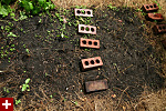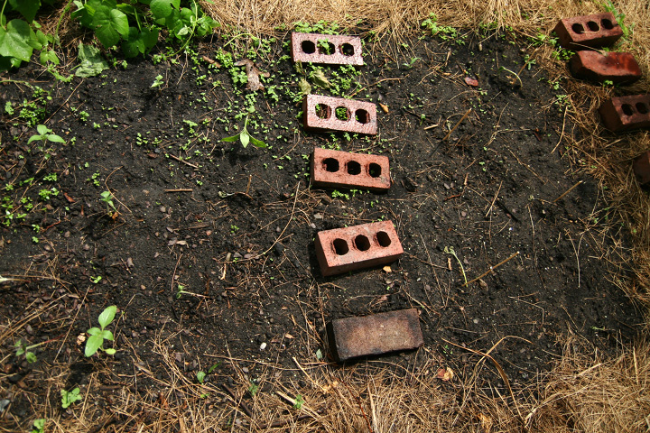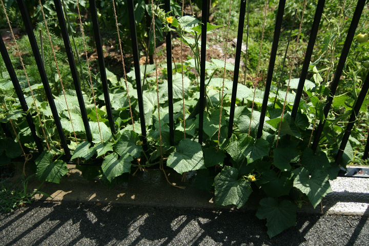 after i was done with my own garden, i went to julie's garden. the cucumbers weren't climbing the strings as i'd hoped, so i moved a few vines, hoping to train them to grow vertically instead of on the ground.