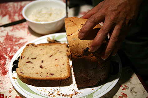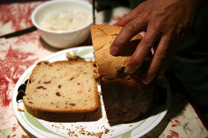 in the evening i went over to my parents' place bringing half a dozen flan i made yesterday and a new craisin bread loaf i baked today. this time around i used just 3 cups of flour to 1 cup of water. the bread was less dense and there was more rise, but i'm still not happy, although it's the best raisin/craisin bread i've made in the past 3 attempts.