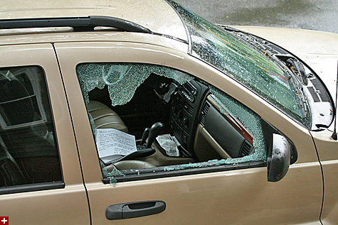 i didn't notice it when i left this morning, but when i came back home i saw the SUV that'd been parked in front of my place had its passenger side window completely smashed. nothing seemed stolen however so i'm not sure what the motivation could've been. some ecoterrorist fed up with gas guzzling sports utility vehicles? if that's the case, there were plenty more SUV's nearby that escaped vandalism. could it have been the out-of-town NY license plates? who knows. inside my upstairs neighbors had left a note, saying how they were up until 11pm last night and didn't hear a thing. i was up until 3am and i didn't anything either. however, i did call the police, who promised they would but never sent a cruiser to come down and investigate the incident (they probably figured the insurance would take care of it). later in the early evening i saw the owners of the vehicle inspecting the damages and taping up the window with plastic wrap.