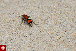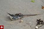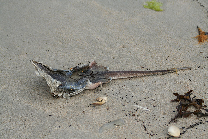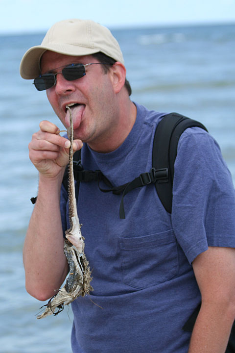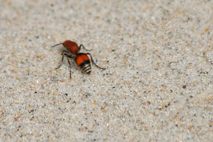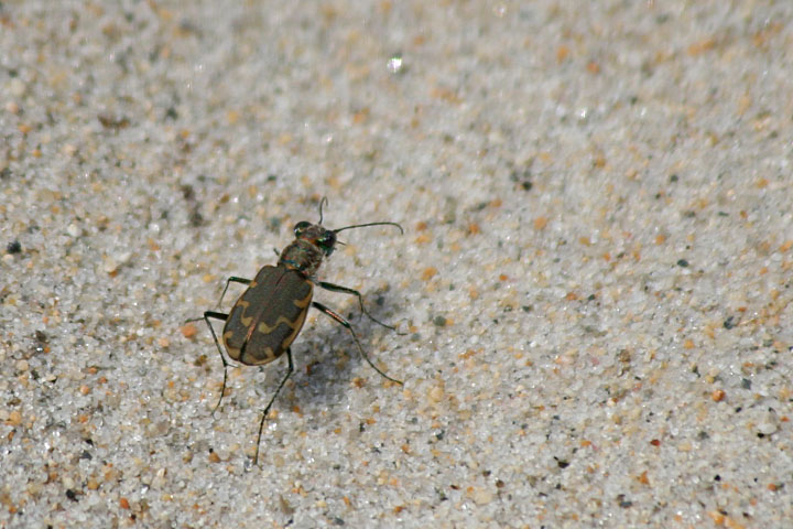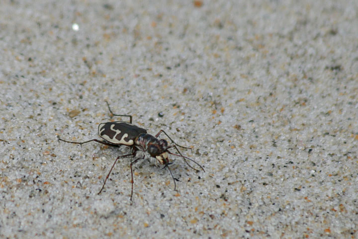 almost all the insects we spotted were seen in the sand dunes. we spotted some greenheads but they left us alone. there were plenty of bronzed tiger beetles, the brown cousins of the more vibrant green ones i usually encounter in the forests. we also saw these colorful red ants which weren't ants at all but rather highly venomous velvet "ants" which are actually wingless wasps. out on the beach i took a casual photo of what i thought to be a bronzed tiger beetle but once i saw the photo i realized it might be a different species: hairy necked tiger beetle. they look similar but this one has thicker maculations (patterns) on its shell. the ocean for the most part cleans the beach of debris but we were still able to find the occasional shell or in this case a dried up skate.
