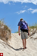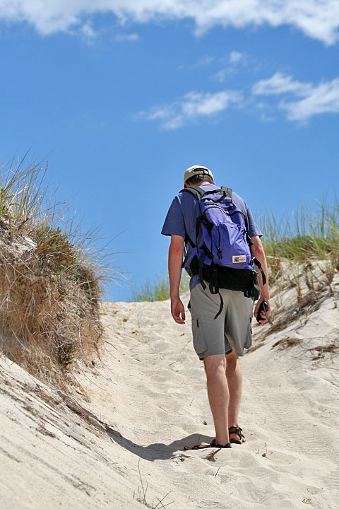 bruce and i first did a short trail that cut through the center of crane beach peninsula. walking on the soft sand was tough business until we managed to get onto the forest path. mosquitoes were abundant in this area and bruce became the designated mosquito magnet as i watched thirsty bloodsuckers swarm onto his naked legs. i swatted as many as i could until my finger tips were covered in blood. i had my jeans on so they didn't seem to bother me much. once we made it out to the sand dunes the mosquitoes left us alone.