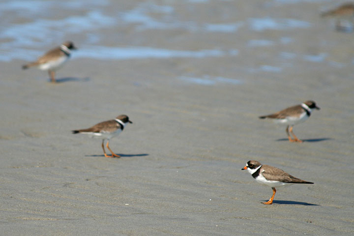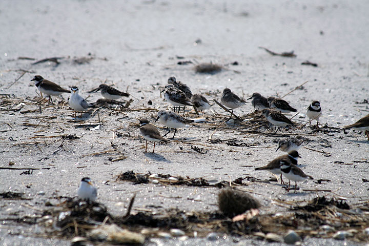they all had excellent camouflage, especially the semipalmated plovers. they had a habit of hiding in the beach debris, which make it even harder to see them. later in the afternoon when the tide was receding, they all came out onto the beach to look for food, running back and forth chasing the waves.