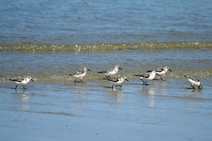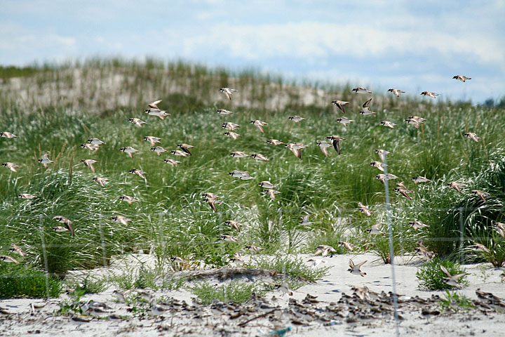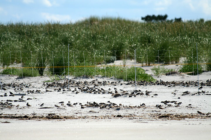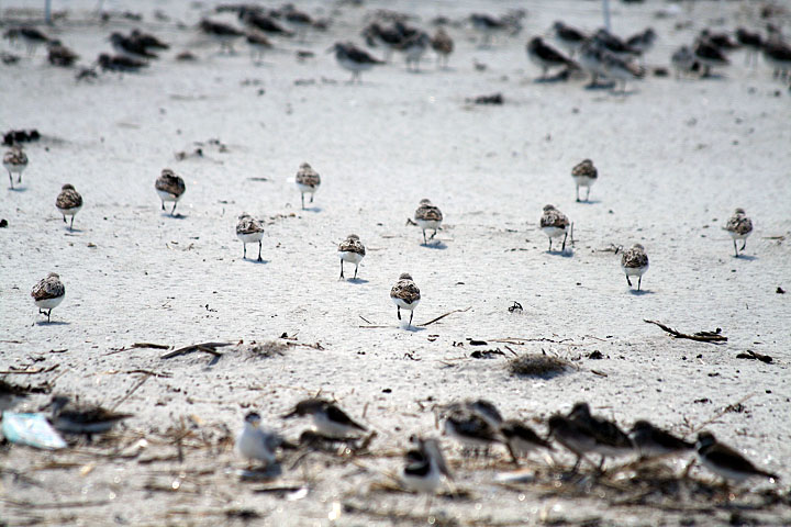as we got closer, we could see some of the other birds. there were large groups of sanderlings and semipalmated plovers. the bird guy mentioned piping plovers but we didn't see any. we also told us about the electrified fencing, which they turn off during the day but turn back on at nights to prevent animals from eating the birds. there must've been hundreds of not thousands of birds congregating in the area. the sanderlings were less afraid than the plovers, but all of them still speedwalked away when felt we were getting too close.