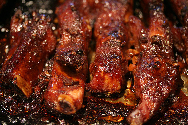 maybe it was the heat. for whatever reason i just didn't feel like doing anything today except lounge around the house. it was too hot and humid to go running, and even too hot to go visit the garden. instead i ate some leftover pizza from last night and watched movies on my computer. i noticed a foul odor coming from inside my fridge. a quick check of the meat bin revealed a forgotten week old package of raw spareribs that was causing the awful smell. besides the smell, the meat also felt sticky, another sure sign of expiration. undaunted, i went through with my original plans of making some honey barbecued ribs. since i'd be cooking it in the oven for 2 hours, i figured the heat would kill whatever pathogen might be living on the meat. it came out pretty well (my house now smells like a barbecue restaurant) but i didn't have time to eat any of it before i left the house in the early evening.