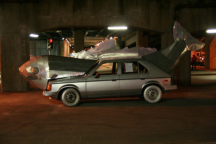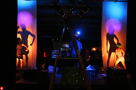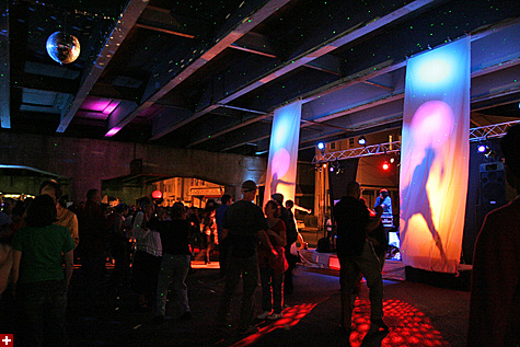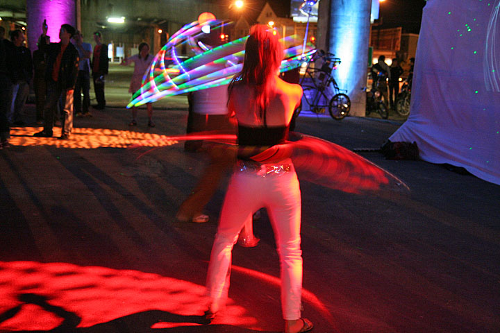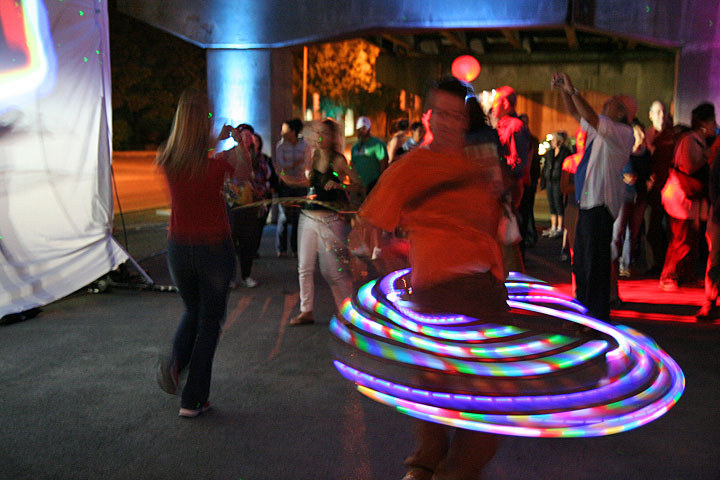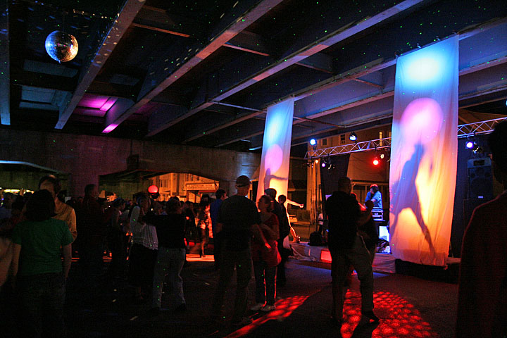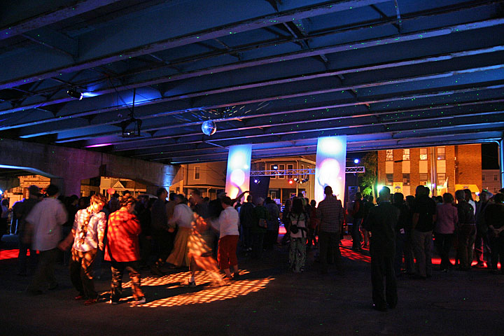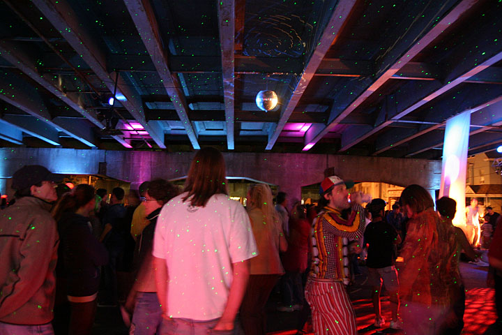 after i finished watching the red sox game, i headed out to mcgrath's highway for the second annual project MUM ("meet under mcgrath"), where they transform the empty spot underneath the bridge into a dance studio. this year's theme was disco and even though the weather had an autumnal bite, there were still a lot of people already congregating below the bridge.