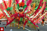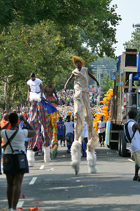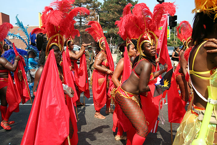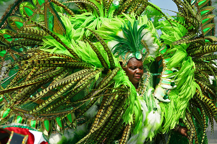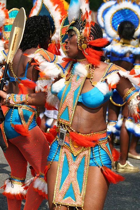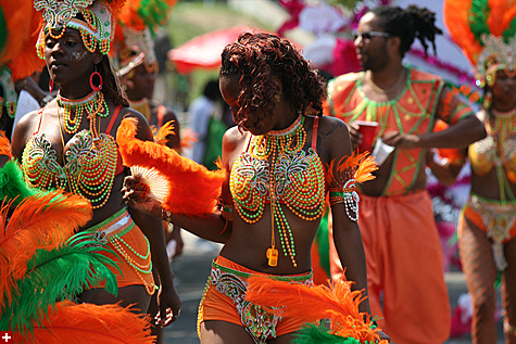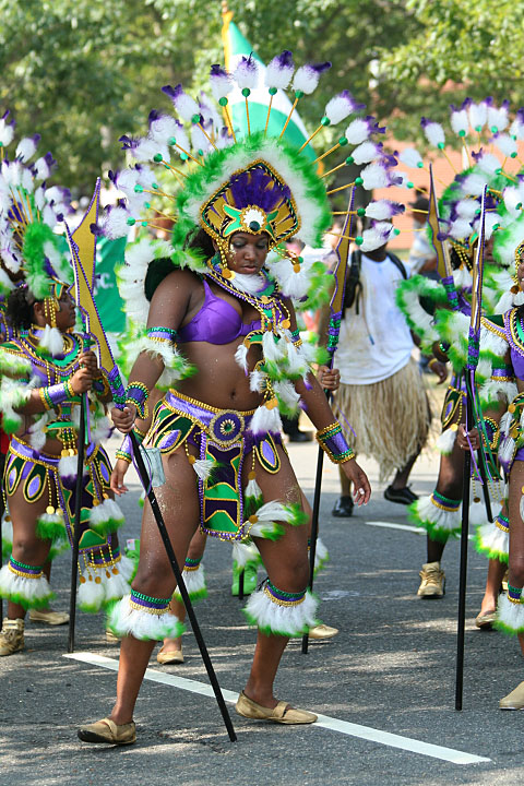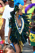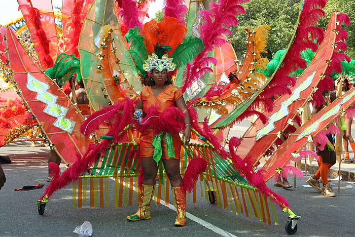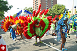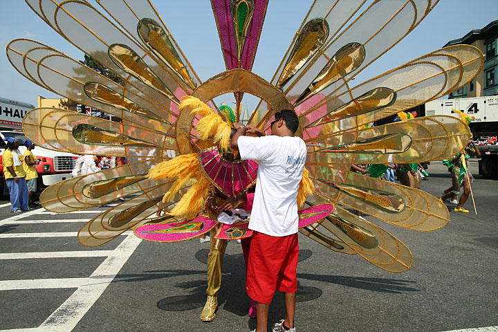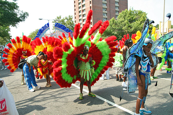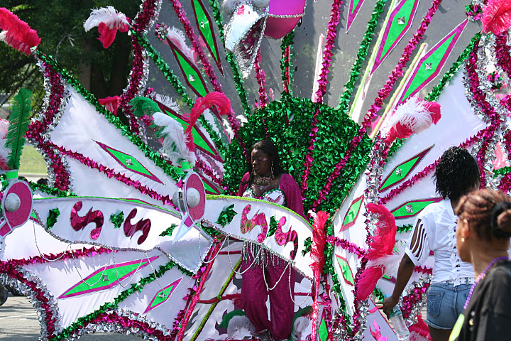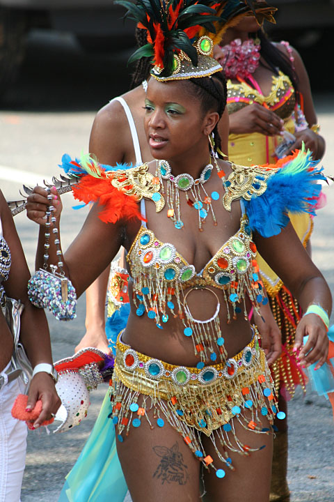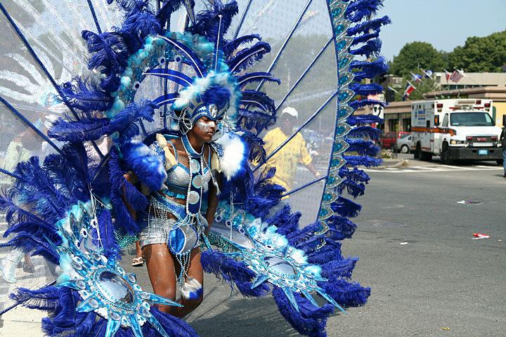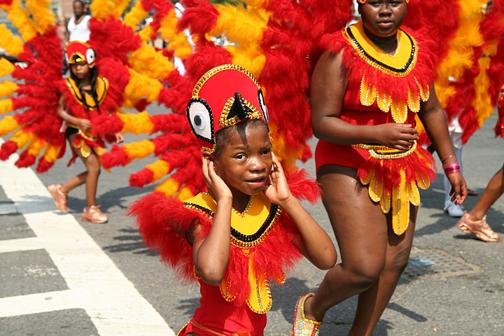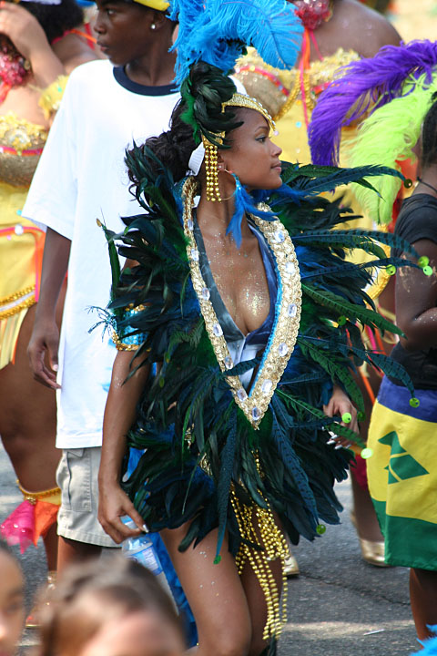 not only was the parade late to start, but it was also disorganized, with crowds of spectators mingling with the carnival marchers, and intermittent stops and starts. however, this didn't really detract from the festivity, and if anything, contributed to the chaotic energy that was surging through the crowd once the colored costumes started coming down the road along with the deafening music. the soca was so loud, at one point i thought my clothes were going to be torn off. i lifted my foot and i could feel the music vibrating out of my sole. i watched a little boy grab his chest, barely able to withstand the sonic assault. by day's end i could barely hear.