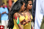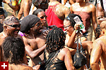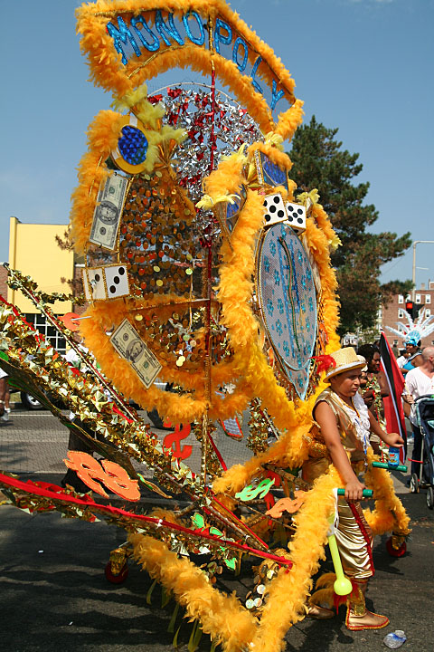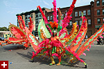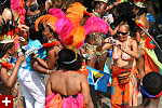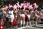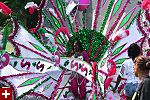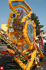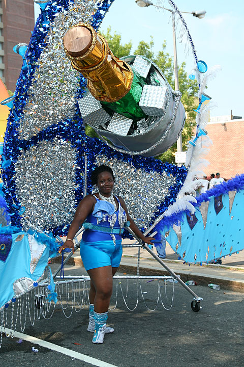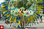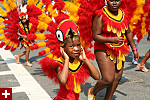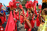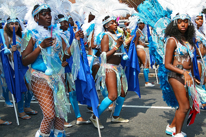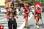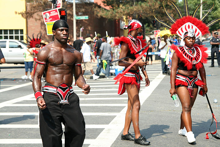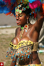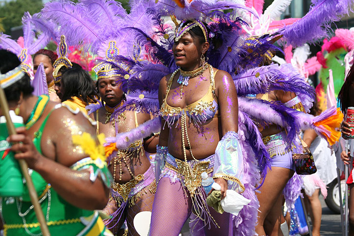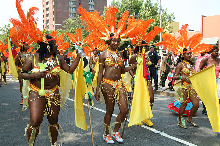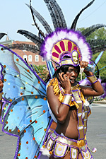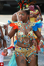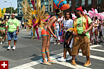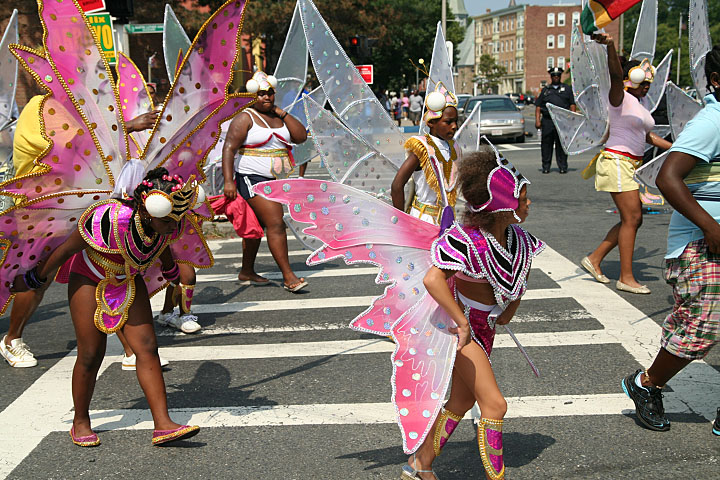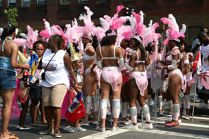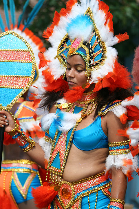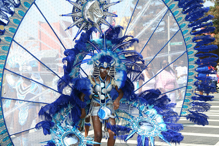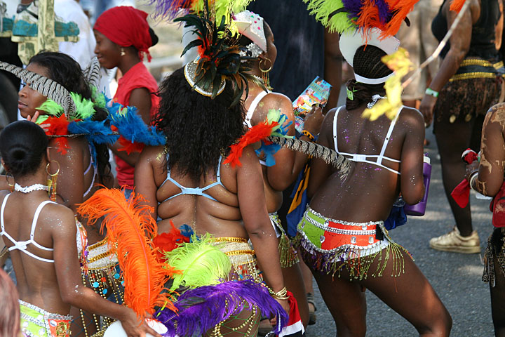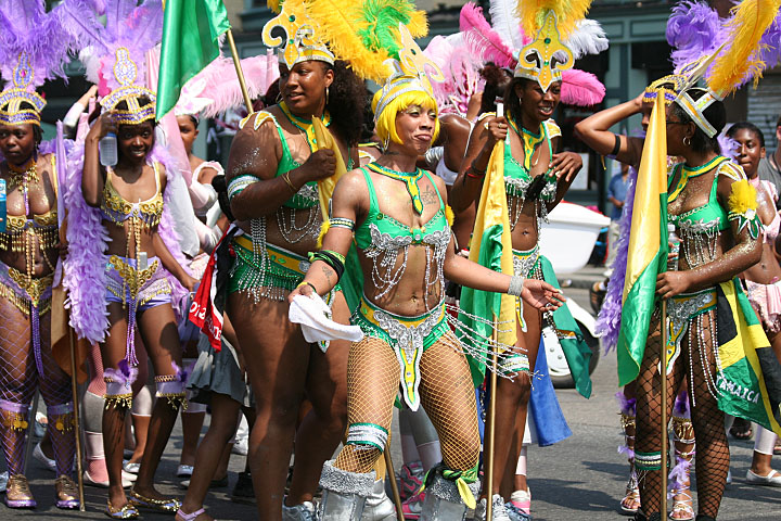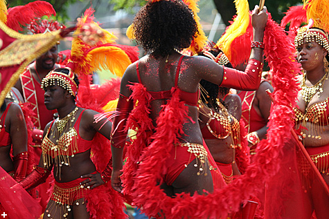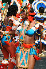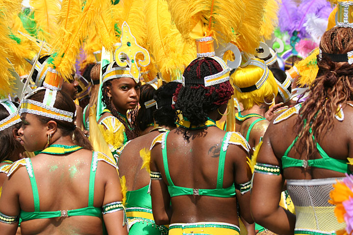 not only was the parade late to start, but it was also disorganized, with crowds of spectators mingling with the carnival marchers, and intermittent stops and starts. however, this didn't really detract from the festivity, and if anything, contributed to the chaotic energy that was surging through the crowd once the colored costumes started coming down the road along with the deafening music. the soca was so loud, at one point i thought my clothes were going to be torn off. i lifted my foot and i could feel the music vibrating out of my sole. i watched a little boy grab his chest, barely able to withstand the sonic assault. by day's end i could barely hear.