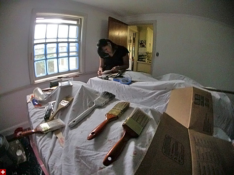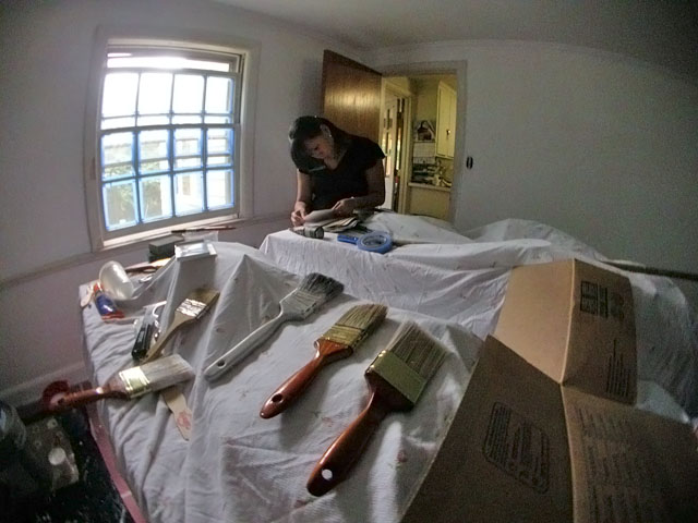 next we planned on priming the windows along with the fireplace (using an oil-based primer). while prepping the fireplace, my father discovered that the preexisting oil paint had separated, leaving a layer of white film on the surface while a hard shell remained on the bottom. he had no choice but to wash off the film before sanding everything down to get the proper adhesion. i was given the task of painting the windows, but i decided i wanted to tape the panes first (to minimize the clean-up afterwards), so that took the rest of the day. my sister helped briefly, when she wasn't trying to pick out the room colors. i went to the cafe afterwards to get some food.