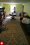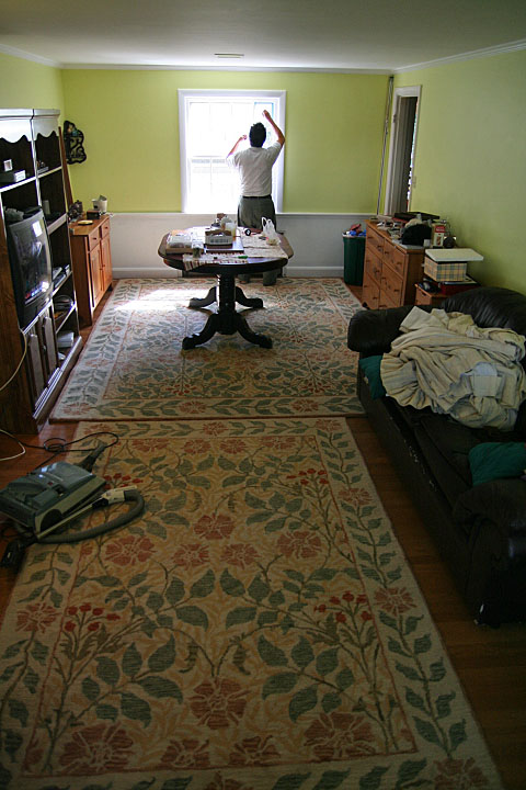 we did a good enough job yesterday that we didn't need a second coat, but i still went around and patched up a few light areas on the wall with a brush. after i was done with that we started a reverse clean-up: disassembling everything, tearing off the blue tape from the windows and floors, removing the pink rosin paper, and finally putting all the furniture back. this took most of the day but by the time we were done the living room reverted back to the way it was before, except with a fresh coat of paint. the mismatched furniture and rugs made the room seem less appealing, but that's an entirely different problem. i'm just the painter.