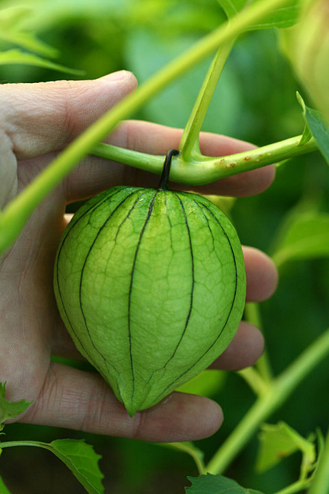 tomatillos are driving me crazy! because the actual fruit is hidden inside the husk, it's hard to tell when they're ripe, or even how much they've grown. the very fact that i even have tomatillo fruits defy logic, since they don't self-pollinate. either somebody else is growing them in the neighborhood, or my new theory is it's somehow hybridized with the small chinese lantern flower i have growing nearby, which belongs in the same family (but aren't really tomatillos though). then there's the two different kinds of "balloons," the green and the yellow.