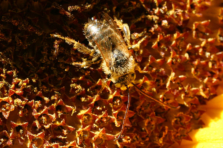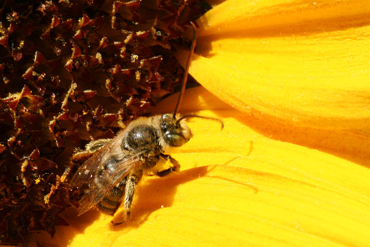 spotted a new insect today: the longhorn bee - so called because of its very long antenna. they're actually important pollinators of sunflowers, which is no surprise because i found it on one of my sunflowers.