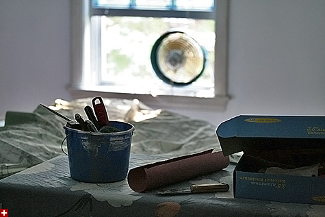 today we started the painting offensive. it took a while though: my father ran off to run errands early in the morning. i went to home depot to get some more blue tape and then i was busy with some light sanding and sponge-cleaning the walls. when my father returned around noon he brought back a more efficient wide mop.
