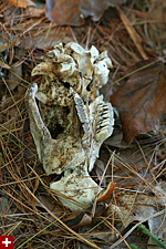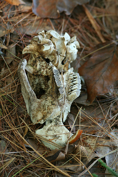 i did some light bushwhacking, following the edge of the marsh, still trying to see some wood ducks. i noticed a small hill and decided to see if i could trace a route to the summit. with my eyes trained to the forest floor looking for mushrooms, i came across a skull. at first i thought it was a coyote skull, but after a more careful look i realized right away it was a beaver skull from the rodent-like incisors.