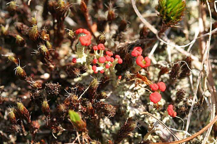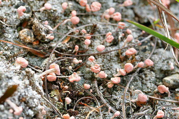 i found some what appeared to be pink lichen growing in a dry opened field. they resembled the british soldiers (any species of lichen) that were also sprouting nearby, and i wonder if these pink ones were just dried up forms of the red ones.