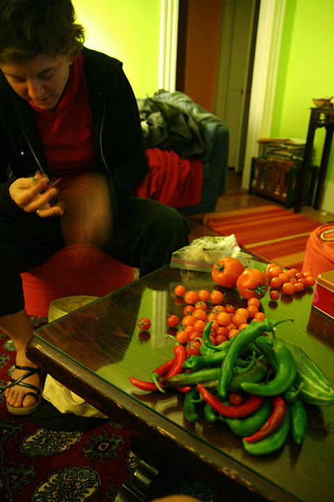 as much as i don't want the red sox to face the yankees in the postseason (the yankees are the only real threat i see), a part of me still thinks that victory is that much sweeter when boston goes through new york to get to the world series. so as much as i cheer to see the yankees lose tonight, part of me sort of wish they did better. julie came over later (shocked to see how messy i've kept the living room), bringing with her some vegetables she picked from her garden this morning, handfuls of salsa peppers and cherry tomatoes. in exchange i gave her a bag of basil.