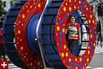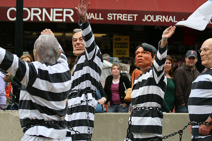 as the parade was winding down, i took the opportunity to get some food before the place got too crowded. i settled for some indian food from one of the food tents, chicken tikka marsala with a mango lassi ($6 + $2). i found a stone bench in winthrop park to sit down and eat. i didn't realize it was also the parade terminal, as band members and people on stilts swarmed around me. just by chance i saw alisa with her friend yvonne (they were meeting me) and called them over. i hung out with them briefly before i excused myself to go home and catch the red sox game. i knew the patriots game was already in progress, and i watched a few minutes on the flat screen tv in the display window of cardullo's. a couple walked by, the guy catching a glimpse of the tv. "we're going home," he said, very matter-of-factly.