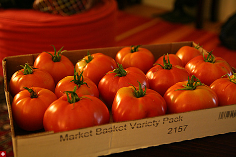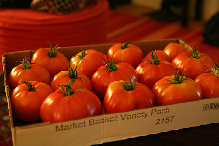 after some lunch at the cafe i went to the garden and collected a big ziploc bag full of basil for my mother and pulled off 15 large red tomatoes. i almost crashed the motorcycle riding home, carrying a heavy plastic bag full of vegetables with one hand. my mother dropped by briefly, after taking my aunt to the nearby laundromat. after she left, i made myself some rice noodle soup for dinner. i watched a nova episode on samurai swords, followed by reaper then a new SVU.