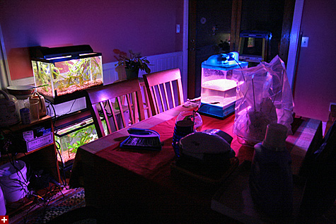 this is what my kitchen/dining area looks like at night. you can see my two *heated* guppy tanks. on the table is another aquarium but i'm using that to grow duckweed. because it's a translucent tank, it acts like a lamp and gives the whole room a fluorescent glow.