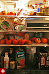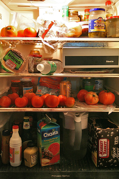 it's time to play: what's in my fridge! not too much stuff, i haven't had to cook in a while, so it's been a lot of bagels for lunch and hot dogs or something defrosted for dinner. you'll notice i have a lot of tomatoes. originally they were on my kitchen counter because i wanted them to ripen, but they started going bad so i threw them all into the refrigerator today. i should really do something with them, like make fresh homemade pasta sauce. i'll have to look into that.