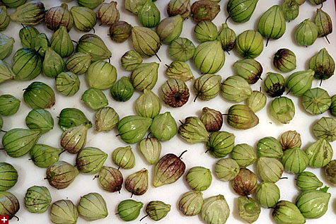afterwards i visited the garden and picked a bag of tomatillos. most of the fruits are small (size of a marble) but there are a few large ones. i got home and set them out to dry on the table.