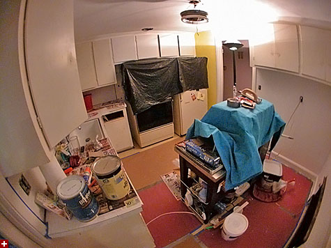 this morning i was doing more painting, this time putting on the 2nd ceiling coat. once that dries, tomorrow we can paint the rest of the walls with color.