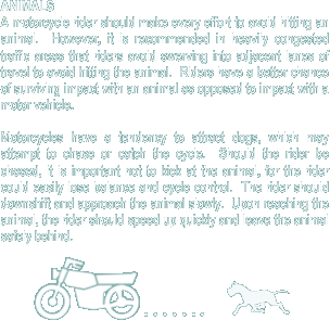 when i finally returned home, the first thing i did was to go online and dig up info about massachusetts motorcycle laws. i came across a pdf booklet published by the DMV expressly for motorcycle owners (i never received one). searching through the pages, i couldn't find any mention of the infraction i was given a warning about earlier, nor anything about lane splitting. however, i did find this interesting tidbit about motorcycles and animals: