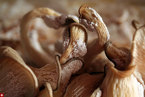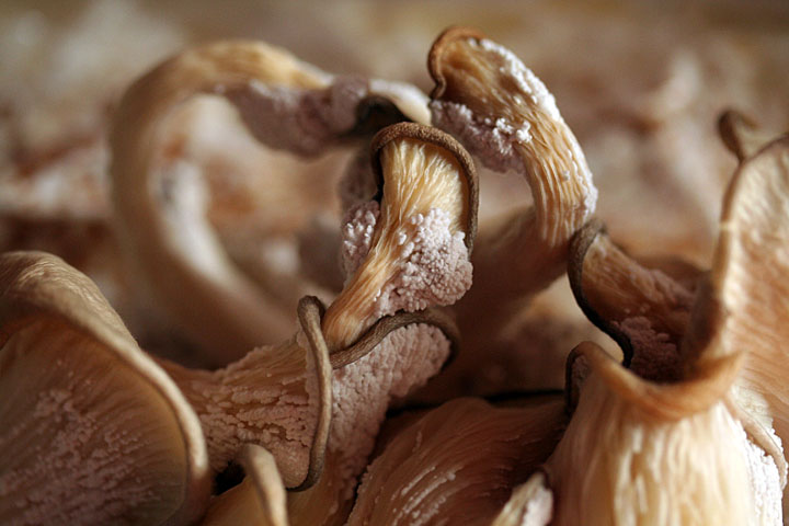 i should've harvested my oyster mushrooms a few days ago. so imagine my horror when i went to water them this morning and found them covered in mold. well, not exactly mold since they weren't fuzzy - they were more like fungus. i removed the bunch and chopped them all up. in a frying pan with some butter, i sauteed everything and had it for lunch. yes, that's right, i ate them, weird additional fungus and all. it tasted like normal mushrooms, although a bit sour. i spent the next few hours waiting for symptoms. what would it be - stomach pains, diarrhea, cramps? but by the end of the day, i was stil fine. once again i survived another round of edible russian roulette.