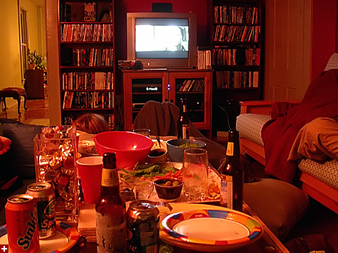 equilibrium (2002): this is another must-see film, and one that i actually saw in the theatres back in december 2002. 5 years later, i still think it has some of the most awesome action sequences i've ever seen. this was also the movie where the most people showed up (between 4-6pm) and i counted no less than 16 guests sprawled on couches and chairs and floor in elias and amanda's living room. though advertised as an action movie, there were many chick flick elements, including christian bale's display of his bicep pillows and a scene involving the rescue of a puppy from execution. however the ending is pure guy-friendly with a climatic gun and samurai sword battle (including a very graphic face slicing).